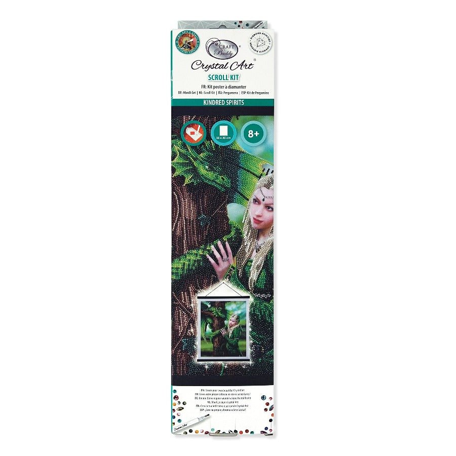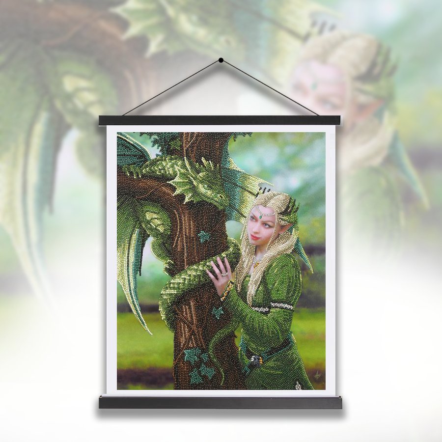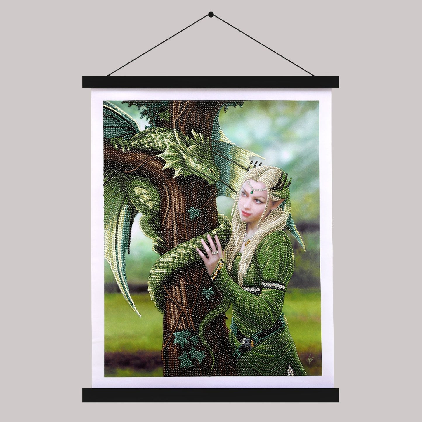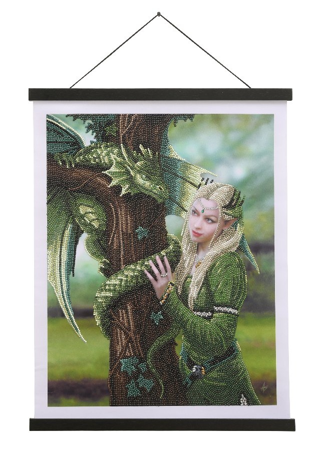 This mystical piece named 'Kindred Spirits' features a peaceful maiden and her magical dragon guardian, in rich shades of forest green. Wrapped around a tree, this baby drake gives an enchanting aura to the illustration, for which artist Anne Stokes is known for. The scroll comes pre-attached to sturdy black wooden hanger bars - simply hang onto a nail or hook in the wall when you've completed your project.