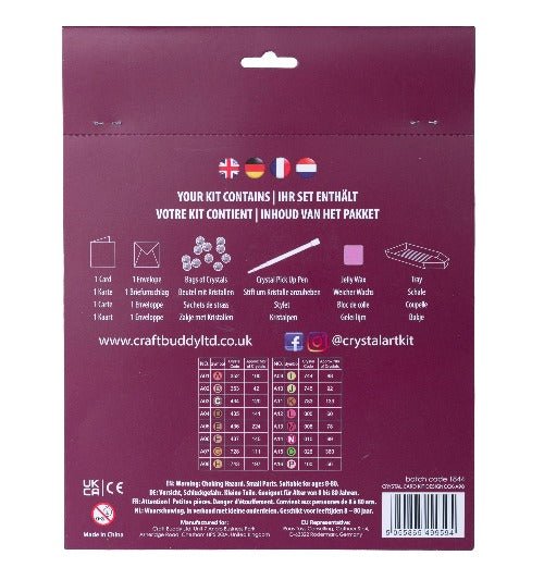 Each Crystal Art® card design has a numbered adhesive template. Just use the handy pick up tool to lift up the coloured crystals and place them on the corresponding numbered dots. All tools are included, as well as instructions, so it is a perfect gift for a crafter, whether a beginner or advanced Crystal Art® fan.