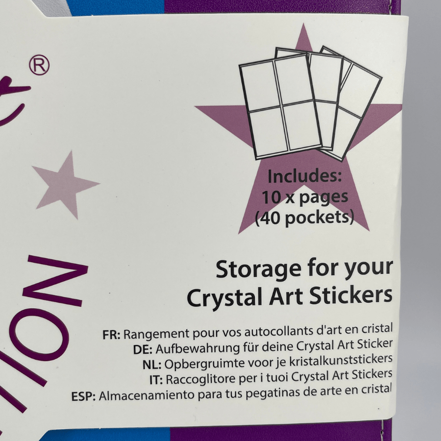 The binder is a large format at 31x35cm, with 4 strong metal rings inside that open easily and close securely. With a thickness of 6cm, there is plenty of room to purchase extra pocket packs, and complete another sticker collection with your own themes or favourites. The album comes with 10 clear plastic pages supplied, so you can get started storing away your stickers. Each pocket can hold two stickers back to back, so each individual page can hold eight in total. You can choose to protect 'finished' crystalised stickers, store a project that is partially completed for safety, or keep sealed sticker packs for later - the pockets are large enough to hold all 3 'stages' of your kit.