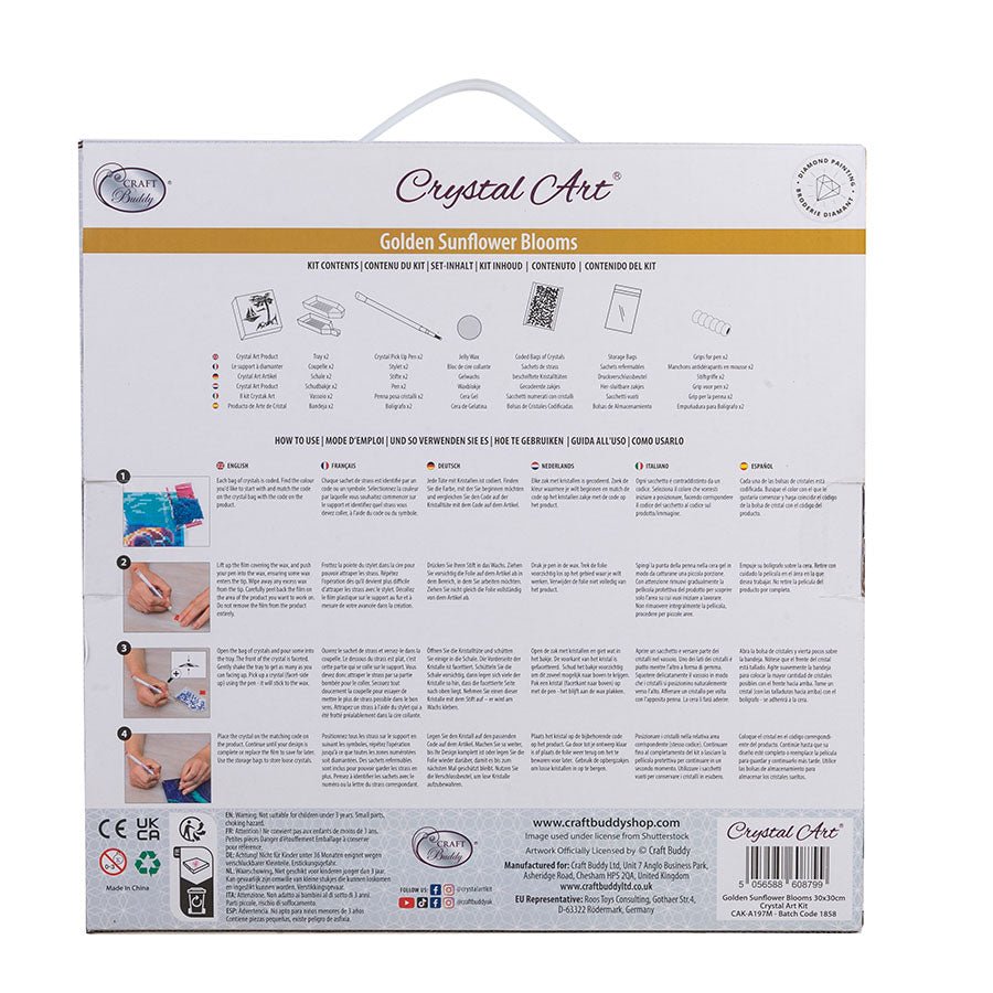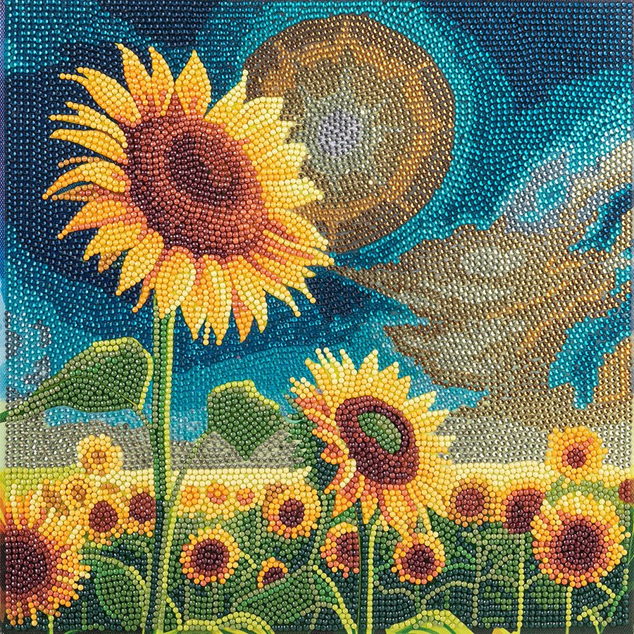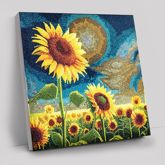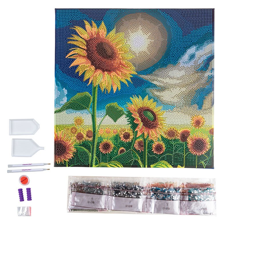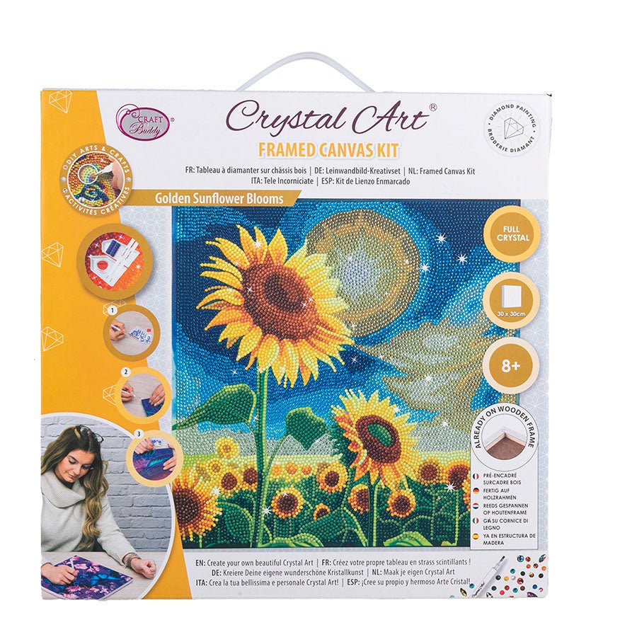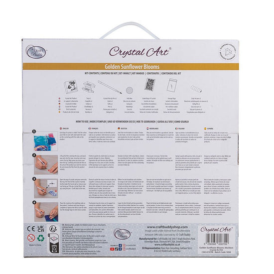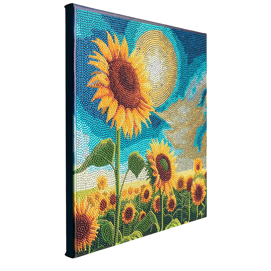 Introducing our "Golden Sunflowers Blooms" 30x30 cm Crystal Art Kit - a vibrant recreation of a gleaming field full of sunflowers in the radiant sunlight. This glorious canvas is an excellent addition to brighten up your walls bringing a touch of nature and beauty indoors.