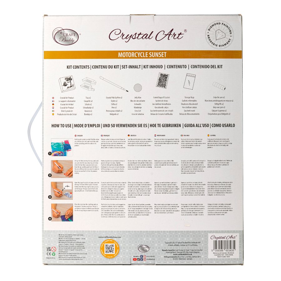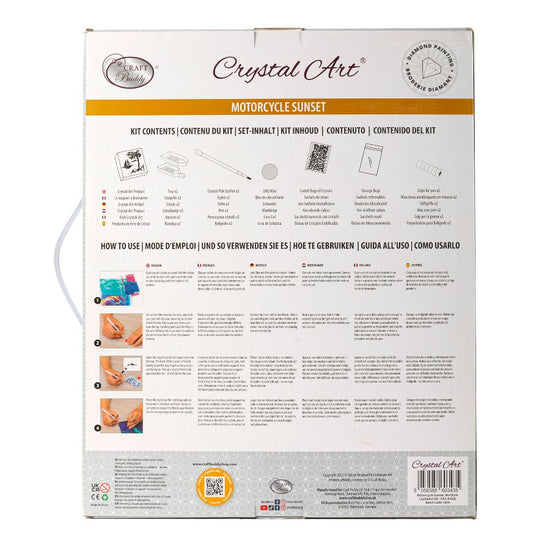 The kit is easy to complete with a numbered adhesive template and all the tools you need supplied. Simply lift up the coloured resin gems from the handy tray and place them on the corresponding numbered dots. The kit has simple instructions so anyone, even beginners, can complete. Give the 'romance of the road' to someone, in pure Crystal Art®!