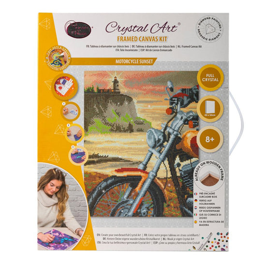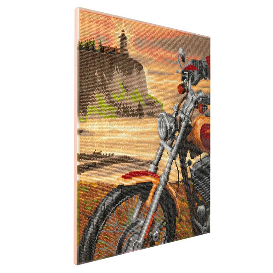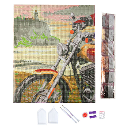 Are you daydreaming of escaping the working week, speeding along on a vintage motorbike, and reaching the beach to catch dusk? The spirit of this feeling is captured here in the Craft Buddy 'Motorcycle Sunset' Crystal Art® Canvas Kit. In vintage-style tones of orange, grey and red, a mystery rider has just caught the sunset and parked on the sand, where a lighthouse gives the only glow. The design is ‘full crystal’ which means all of the surface is covered in gems to give great impact. Why not craft this cool canvas for a husband, brother or son, to place in the 'Man-Cave', the shed... or next to his own bike in the garage?