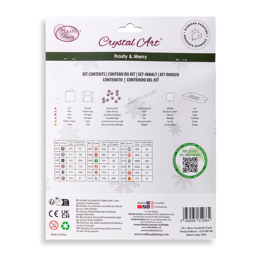 What better way to greet the holiday season, than to send a 'traditional' themed Christmas Card? With this charming Craft Buddy 'Frosty & Merry' Crystal Art® Card Kit, you can spend a mindful moment amidst the rush of the season, with this sparkling DIY craft set. Who can fail to be charmed by this Snowman couple, decked in bright red scarves and hats trimmed with holly, in a snowy landscape. The frosty diamond art will really twinkle as you accent this 'partial crystal' card, so the gentle illustration shows through, which also runs across the back. This card is blank for your own greeting so why not add a personal note or message, and include a matching 18cm x 18cm frame so your loved one can keep this as a really special Christmas memory? Soon to be available in a charming box set, why not choose this individual design and get the Crystal Art® fun started early.