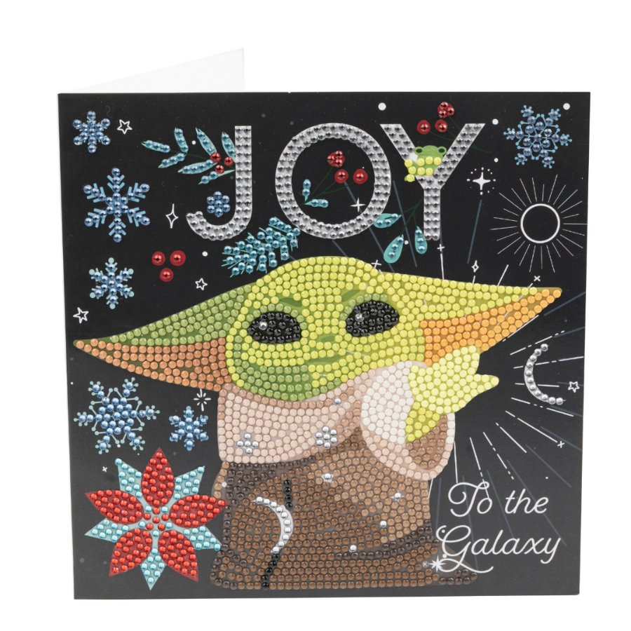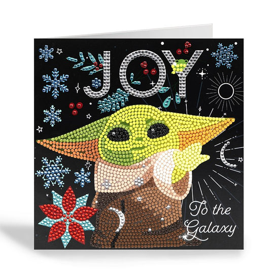 Bring some joy to the galaxy with this adorable Crystal Art® card featuring Grogu, the beloved character from Star Wars. This officially licensed card is a perfect gift for any Star Wars fan or Crystal Art enthusiast. With this fantastic card kit, you can spend a mindful moment amidst the rush of the season, with this sparkling DIY craft set. A bright patterned background features the cute version of this character from the Star Wars. Universe. The embellished diamond art will really twinkle as you accent this 'partial crystal' card, so the background shows through for contrast and texture. This card is blank for your own greeting so why not add a personal note or message, and include a matching 18cm x 18cm frame so your loved one can keep this as a really special Christmas memory?