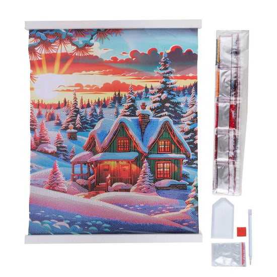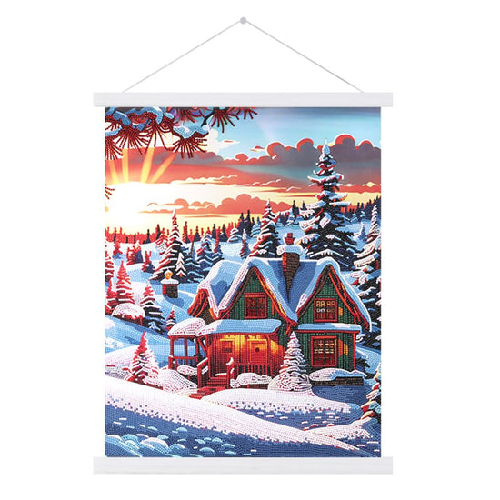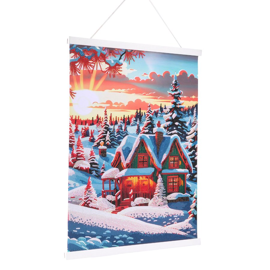 This stunning Crystal Art® Scroll from Craft Buddy gives your home decor 'Seasonal Sparkle'. In beautiful orange and blue tones with a contemporary graphic illustration, it has a crisp snowy feel, with an ice-capped cottage disappearing into sunset. Hung in a modern hallway, kitchen or bathroom, it would bring festive spirit of Christmas to your home. It is lightweight and comes ready to hang with top and bottom wooden hangers in white wood, and a string so you can hang onto a nail or hook when you've completed your project.