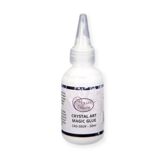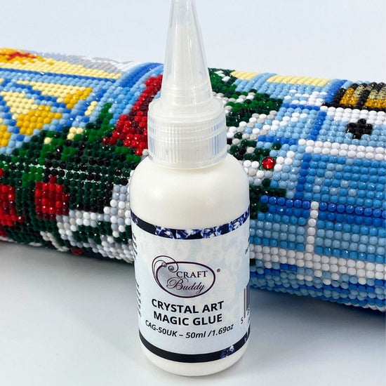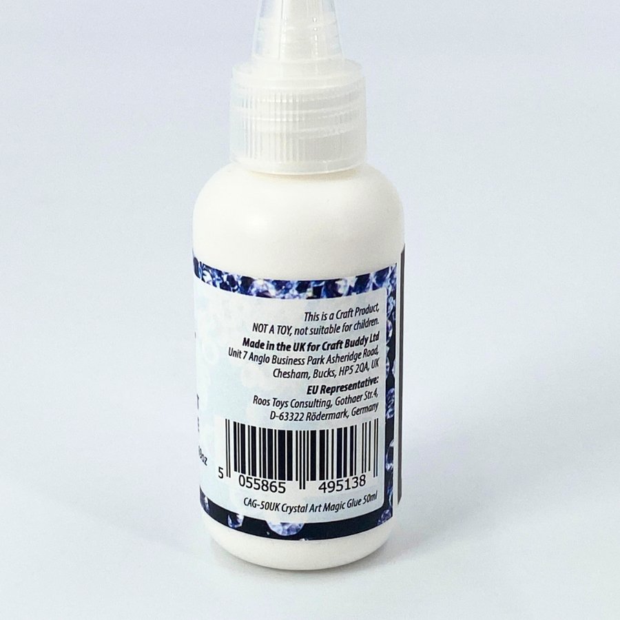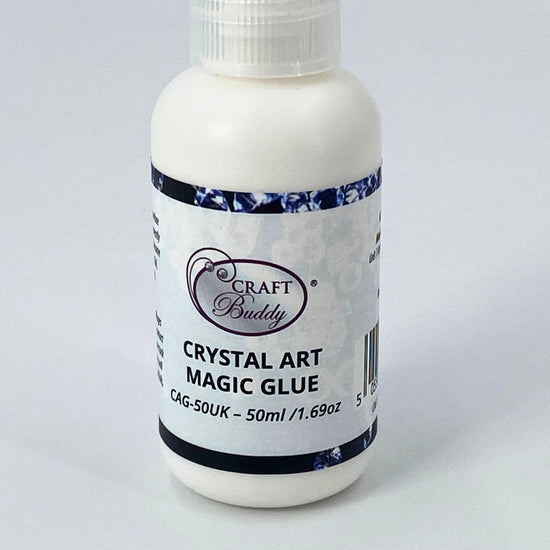 Crystal Art® Magic Glue is a transparent elastic glossy water based adhesive which is perfect for all your crystal art projects. You can apply a thin layer of our exclusive Crystal Art® Magic Glue on your work surface with a brush. The glue will remain permanently tacky and will dry clear. Wait for the glue to become completely clear before adding glitter, foil, rhinestones or other embellishments.