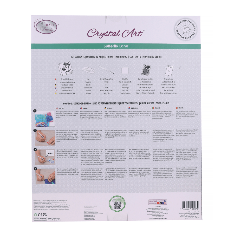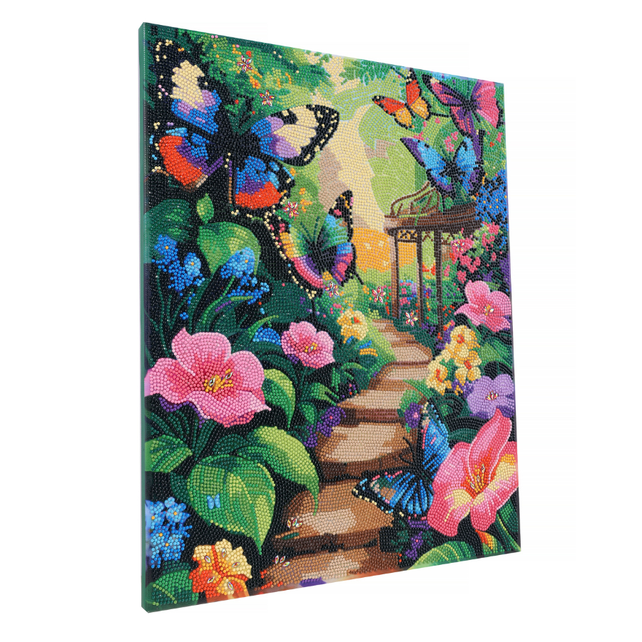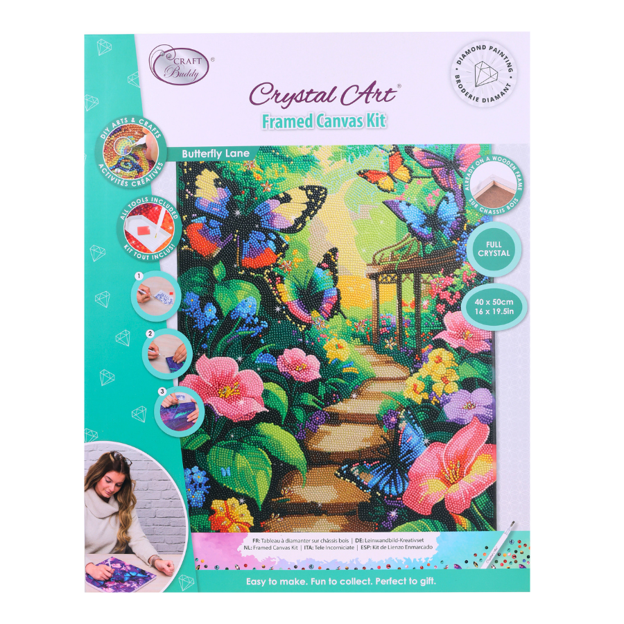 Bring a whimsical touch to your crafting with the 'Butterfly Lane' Crystal Art® Canvas Kit from Craft Buddy. This vibrant design features an enchanting garden pathway leading to a pagoda, with a cascade of bright butterflies fluttering along the way. The stunning artwork is enhanced with full crystal detail, making the butterflies’ wings shimmer in every colour of the rainbow. Measuring 40 x 50cm, this kit includes everything you need to create a dazzling crystal masterpiece, including a pre-stretched adhesive canvas, sparkling resin crystals, and all the essential tools. Sit back, relax, and enjoy a rewarding crafting experience as you bring this beautiful scene to life.