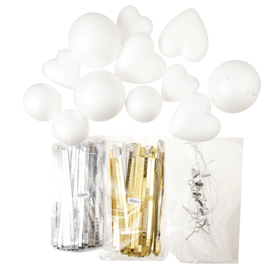 - 6 x 6cm decorations (3 hearts / 3 balls)