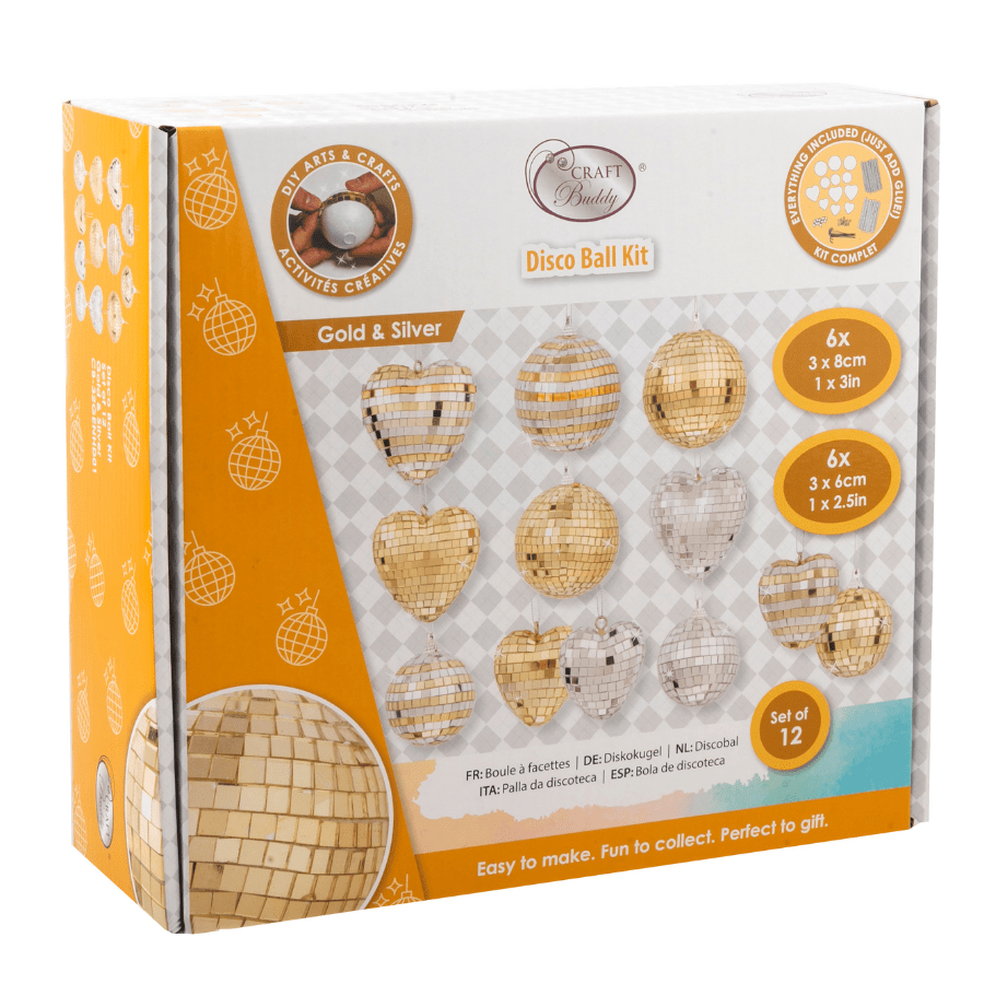 The Craft Buddy Multicoloured ‘Disco Ball’ Hanging Decoration Set brings boho party vibes all year round. Whether you love Christmas in July, disco style, or simply want to add sparkle to your home décor, this kit is made to shine. Inside, you’ll find 12 polystyrene decorations in heart and ball shapes, in two sizes (6cm and 8cm), perfect for creating eye-catching displays. Mix and match classic shades of gold and silver to suit your style. The self-adhesive mosaic strips are easy to use – wrap, cut, and design your own patterns for a bold or subtle finish. Hang with the included silver caps and strings, or display in a bowl for a glitzy centrepiece.