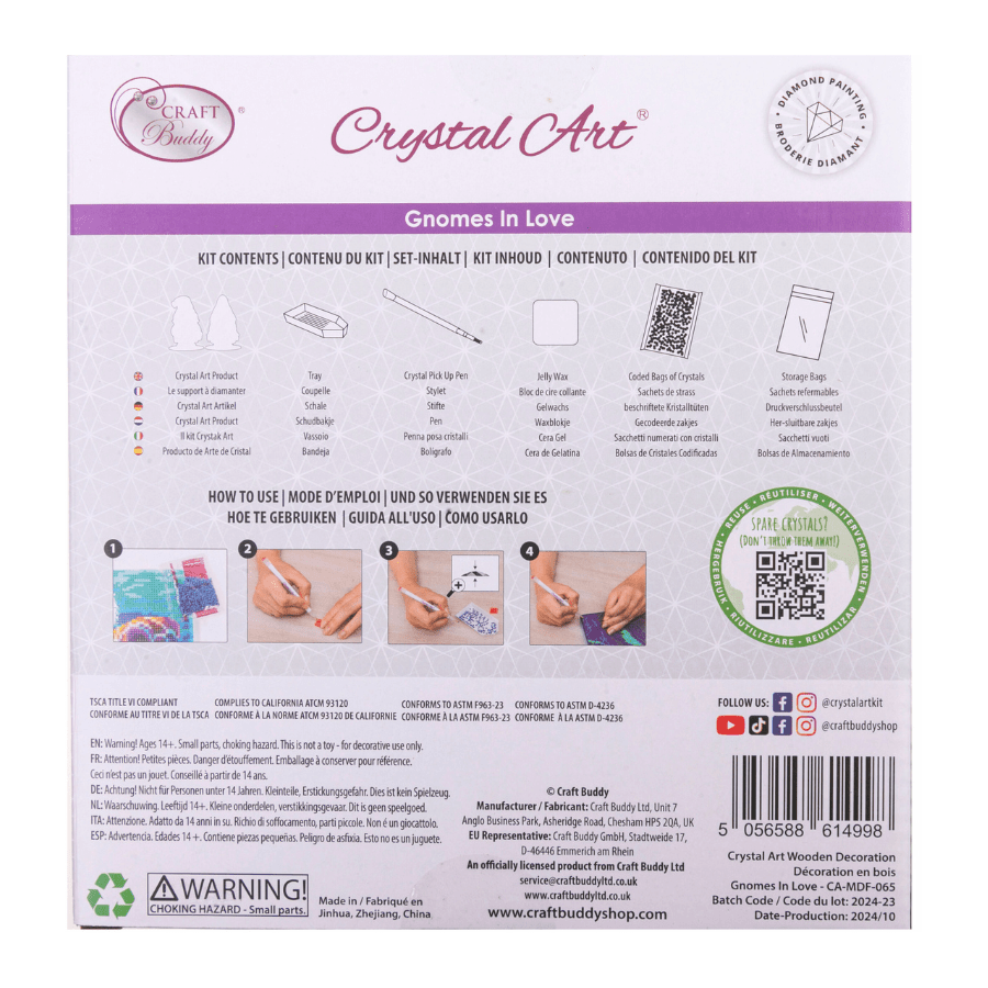 The kit comes with two cut-out MDF shapes, both with a handy template guide, so all you do is match with the crystals and press in place with the handy tool. It is a full-crystal kit, meaning no part of the design is left plain, and both sides are printed for maximum sparkle. However you display them, it is a fun way to 'share the love' with Crystal Art®.