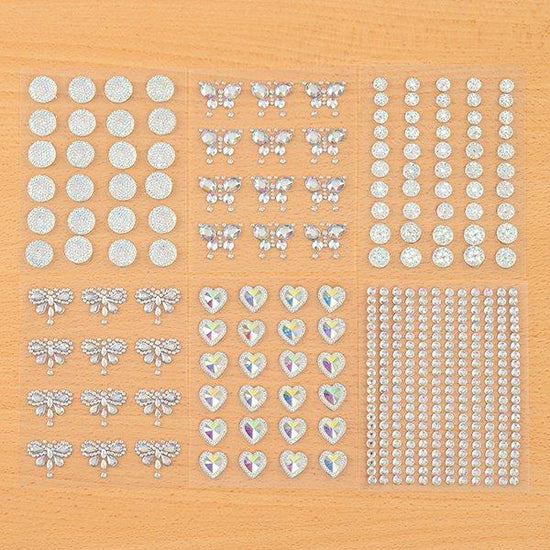 Add the finishing touches with thise set of AB Clear gems from CB. In this set you will receive 6 packs of self adhesive AB Clear gems in an assortment of shapes and designs including rounds, butterflies, dragonflies and hearts.