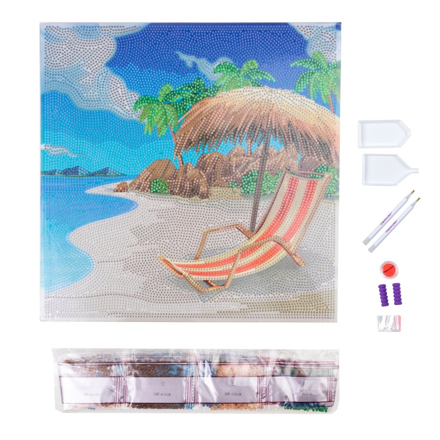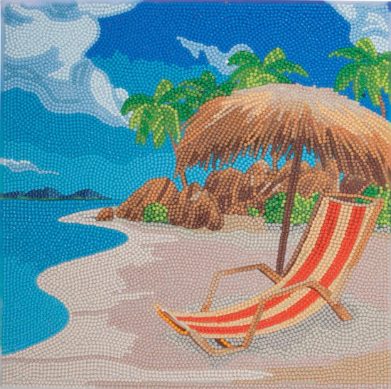 Introducing our exquisite "Beach Life" Crystal Art Kit, sized at 30x30cm—a breathtaking crystal masterpiece. Picture a serene beach chair nestled in the golden sands, shaded by a graceful umbrella. The crystal blue waters gently caress the sandy shore, harmonizing with the clear azure sky. This captivating scene almost transports you to the tranquil shores, evoking the essence of beachside bliss.