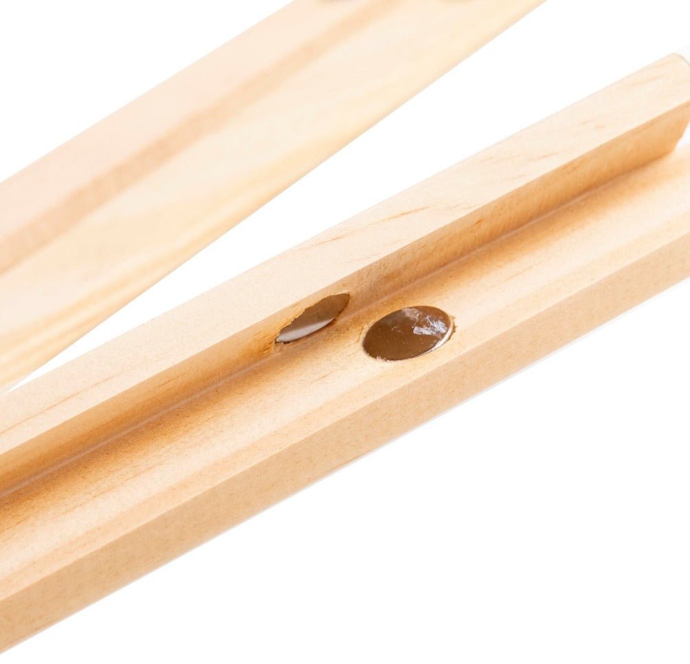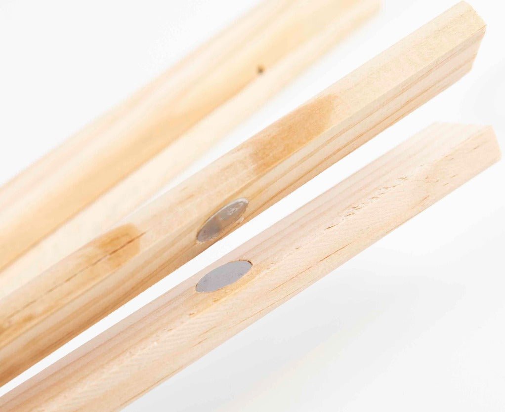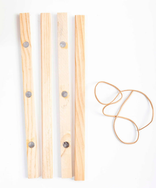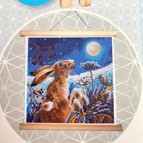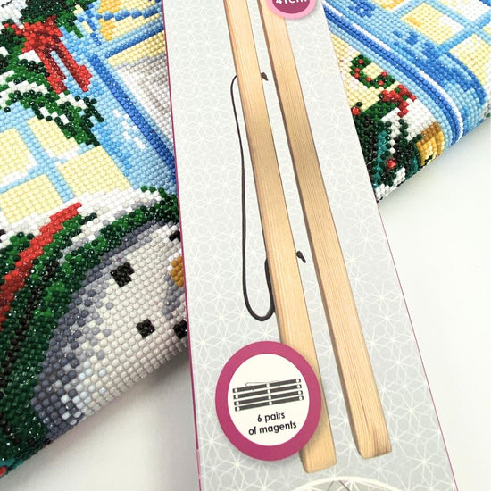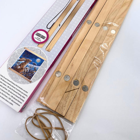 The kit consists of 4 lightweight wooden batons that clamp together, top and bottom and 'trap' the canvas, paper or photograpy safely, without damage. The small magnets in each piece of wood means that there is no glue, pins or tape needed, and you can simply pull apart and remove your art easily without damage. Although lightweight, the magnets are strong, so will hang a large canvas, complete with all the crystals securely!