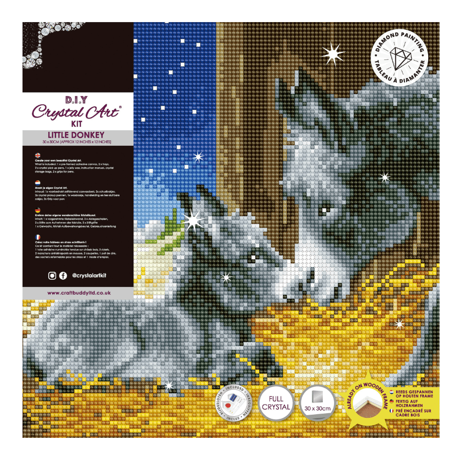 With the Craft Buddy 'Little Donkey' Crystal Art® Canvas Kit is like the namesake of the popular carol. Create this touching image to add your diamond painting to , where a Donkey and his Mother a sharing a moment under the Nativity sky. This kit allows you to enhace their fur, the night sky and even the Christmas Star with sparkling crystals.