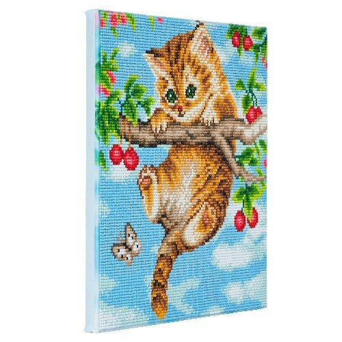 Presenting our adorable "Cherry Kitten" Crystal Art Kit, sized at a charming 30 x 30cm. Playing on a cherry tree branch is a striped orange cat, its bright green eyes radiating warmth and charm as they gaze at you. A delicate butterfly flutters nearby, adding a touch of whimsy to the scene, all set against a vivid and sunny sky backdrop.
