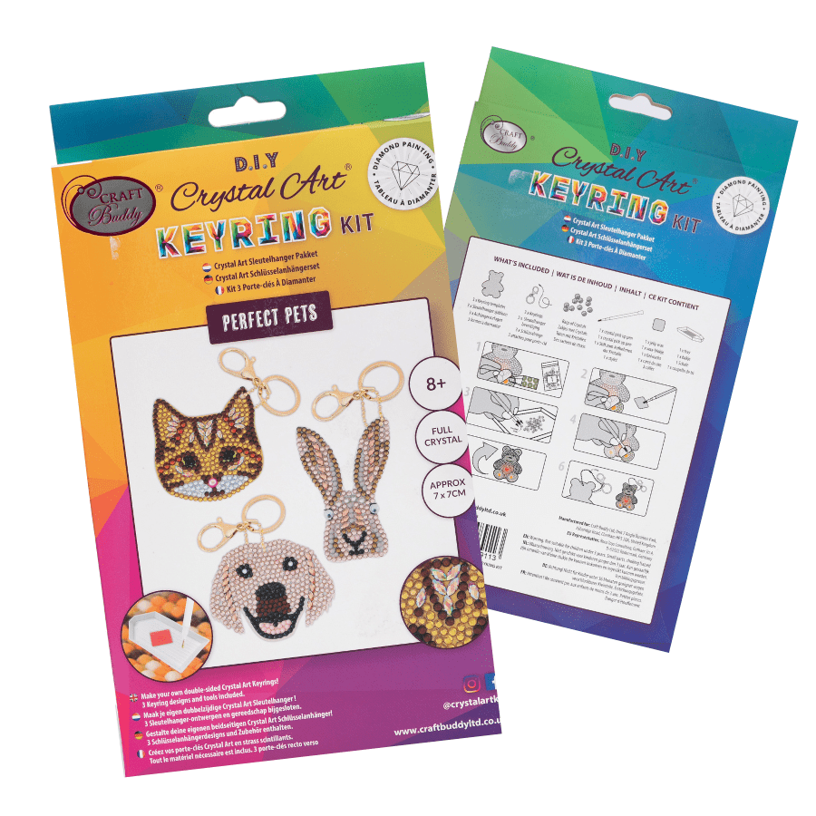 Make and take this fun pack of three 'Perfect Pets' key rings, and give your accessories some glimmer! In three of our favourite creatures to share our homes with, the Craft Buddy Crystal Art® 'Perfect Pets' Keyring are just that... perfect for attaching to keys, bags or satchels. You get three friendly creatures to create - a Dog, Cat and a Rabbit, so children and beginners can make and use them easily.