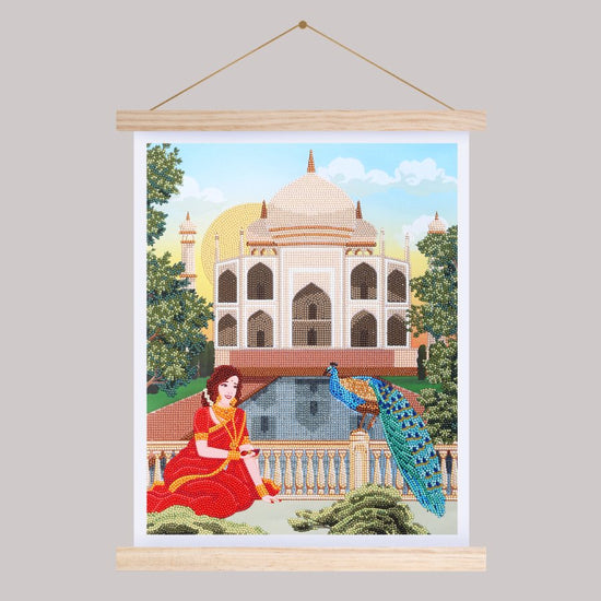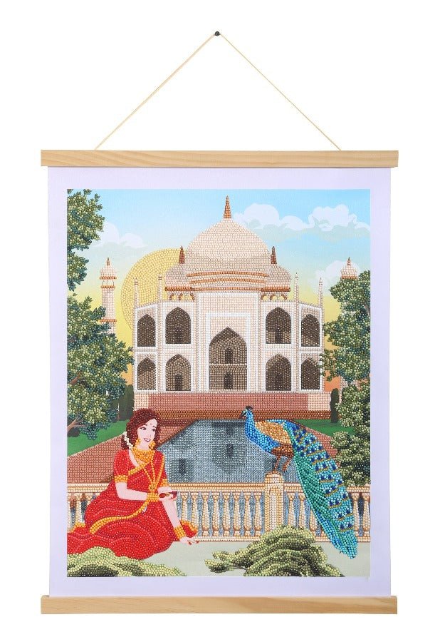 Experience the opulence and beauty of India with our Crystal Art 35x45cm Scroll Kit - Taj Mahal. This kit features a stunning image of an Indian lady in a vibrant red saree, sitting next to a majestic peacock. In the background, the iconic Taj Mahal can be seen, adding to the grandeur of the scene.
