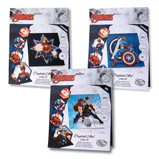 The MARVEL Avengers has taken the world by storm, and become a 'Mega-Franchise'. In this 'Mega-Bundle' of the most iconic Superheroes - 'Captain America', 'Thor', 'Hulk', Iron Man', 'Spiderman' and 'Captain Marvel' have been given the Craft Buddy Crystal Art® treatment, in their glittering glory. This amazing set of six 18cmx18cm greeting cards are blank inside, making them perfect for any occasion, and MARVEL fan! All tools are included, as well as gems and a white envelope. Each card has an adhesive template, so all you have to do is match the coloured crystals and place them on the corresponding space. Make your own heroes' special day with one of these powerful cards!