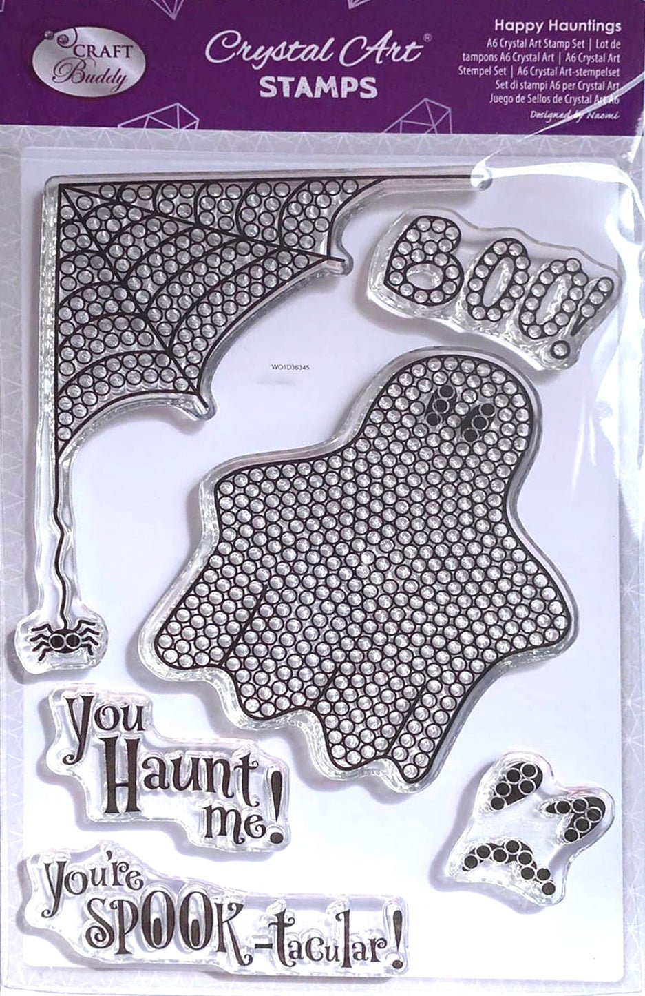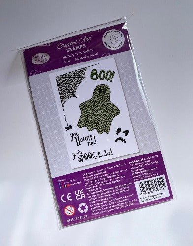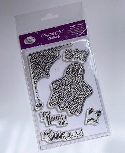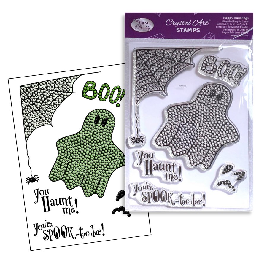 Create gorgeous cards, gifts, and home décor projects with the new Halloween special 'Happy Hauntings' stamp set. The stamped images contain small dots, perfectly sized to fit leftover Crystal Art® drills, self-adhesive gems, pearls or liquid drops and glitter glue. These enable you to create Crystal Art® images again and again!