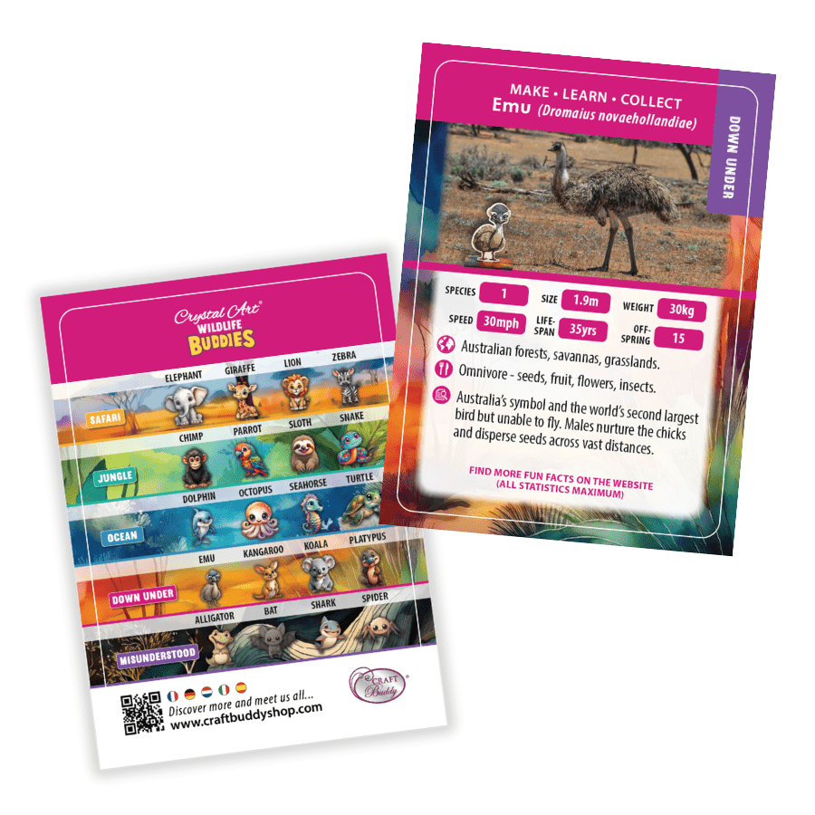 New for 2025, Craft Buddy brings you the collectable Crystal Art® Wildlife Buddies series. Featuring 20 original animal designs, each Crystal Creature has been given the diamond painting treatment, with fur, fins, tentacles and tails that will sparkle and shine. The new 'Series 5' range is made to be collected, whether you choose your favourite species or habitat. Why not go on a trek across wild deserts or swim the deep blue sea and collect the entire range!