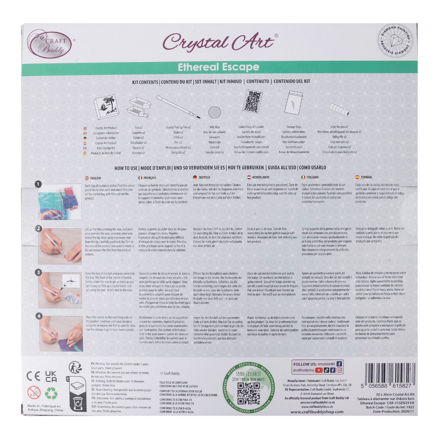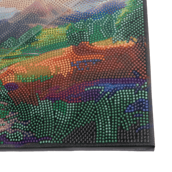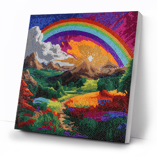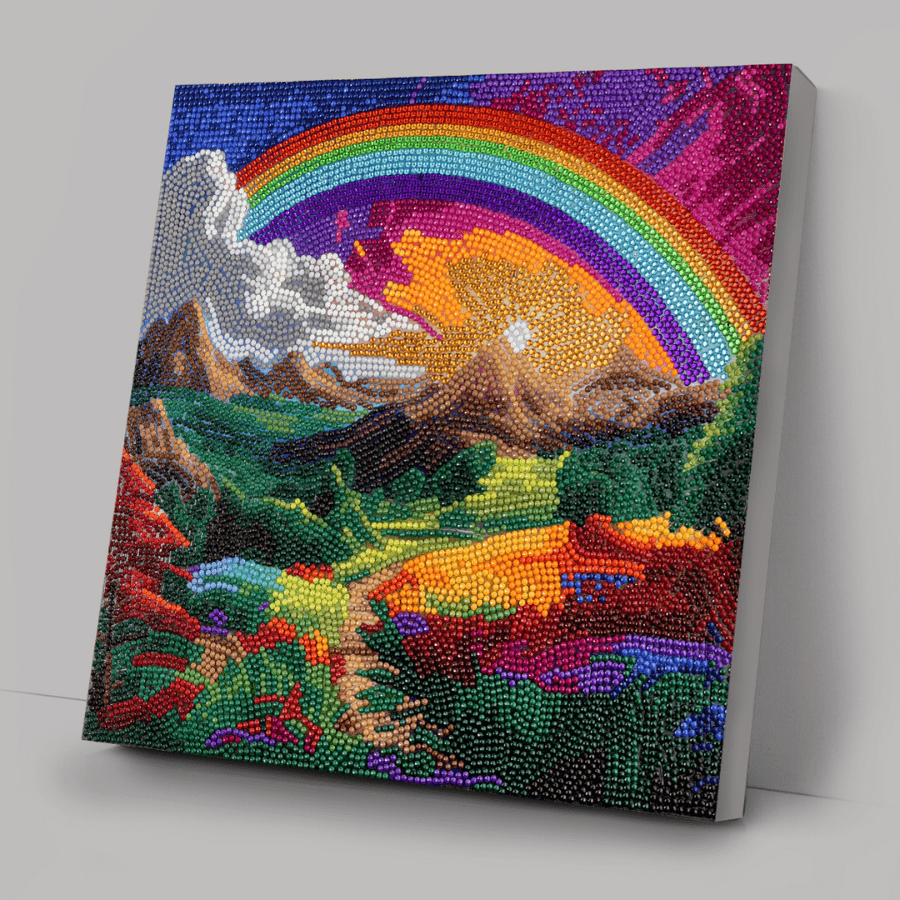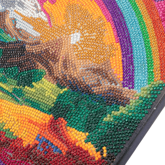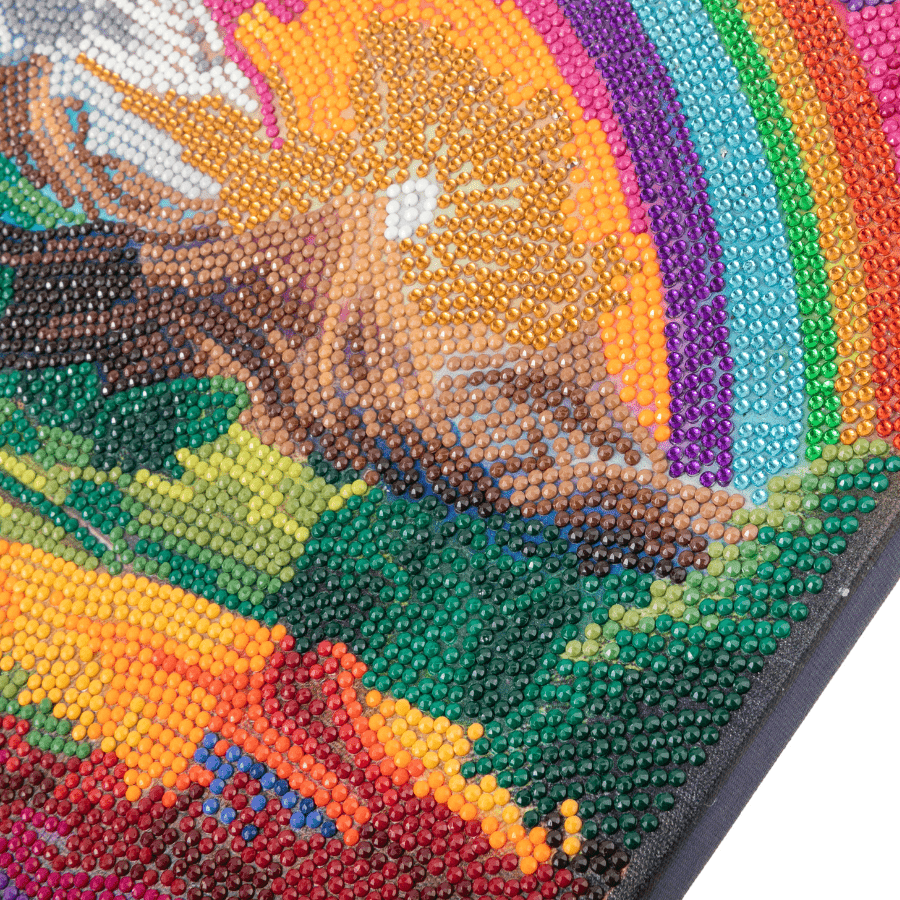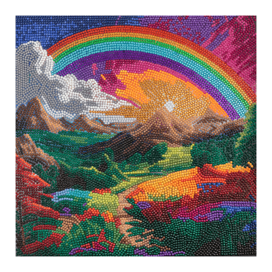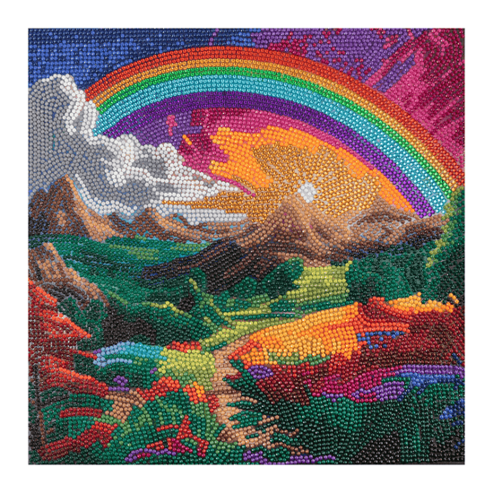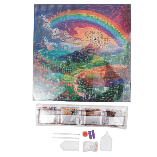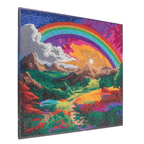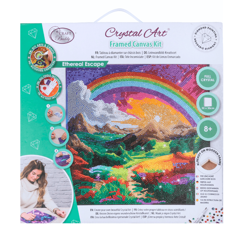 The 'Ethereal Escape’ 30x30cm Crystal Art® Canvas Kit conjures up a feeling of light and air in its colourful design. In bright colours, it depicts a rainbow over a vibrant mountain path, and will be a joy to add your diamond art to! It comes with the finest quality crystal drill gems to craft with, so all you need to do is peel of the film, and add the diamonds to the corresponding coded spaces on the template.