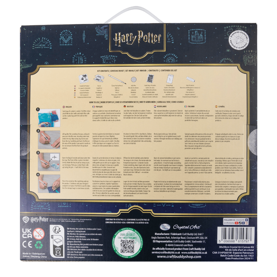 The small size 30x30cm canvas comes in ‘partial crystal’, which means some of the design is without gems, to give contrast and texture. It also makes it an ideal kit for a beginner to this amazing DIY craft, and as an introduction to the amazing world of Harry Potter. All you need is in the kit, from tools to gems and easy-to-follow instructions, and it already comes mounted on a lightweight board, so ready to hang when you are finished. Create a magical piece of art to display at home, or gift to a fan of the world of Harry Potter!
