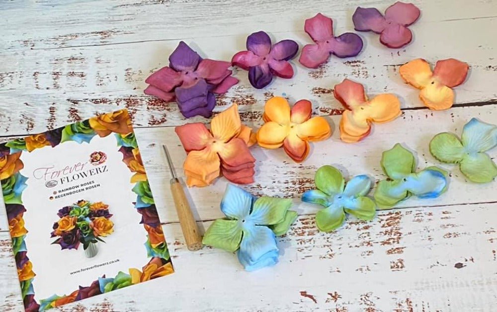 With endless combinations and a lasting finish, this kit makes creativity bloom with every petal. The flowers are made up of 4 different shapes of petals and some key components from our accessories ranges to hold them all together. They are so simple to construct, just follow the step by step instructions to complete your beautiful Rainbow Rose. There are enough materials and tool to make 60 Rose flower heads, across 3 colours, or mix them up to create a Rainbow Rose!