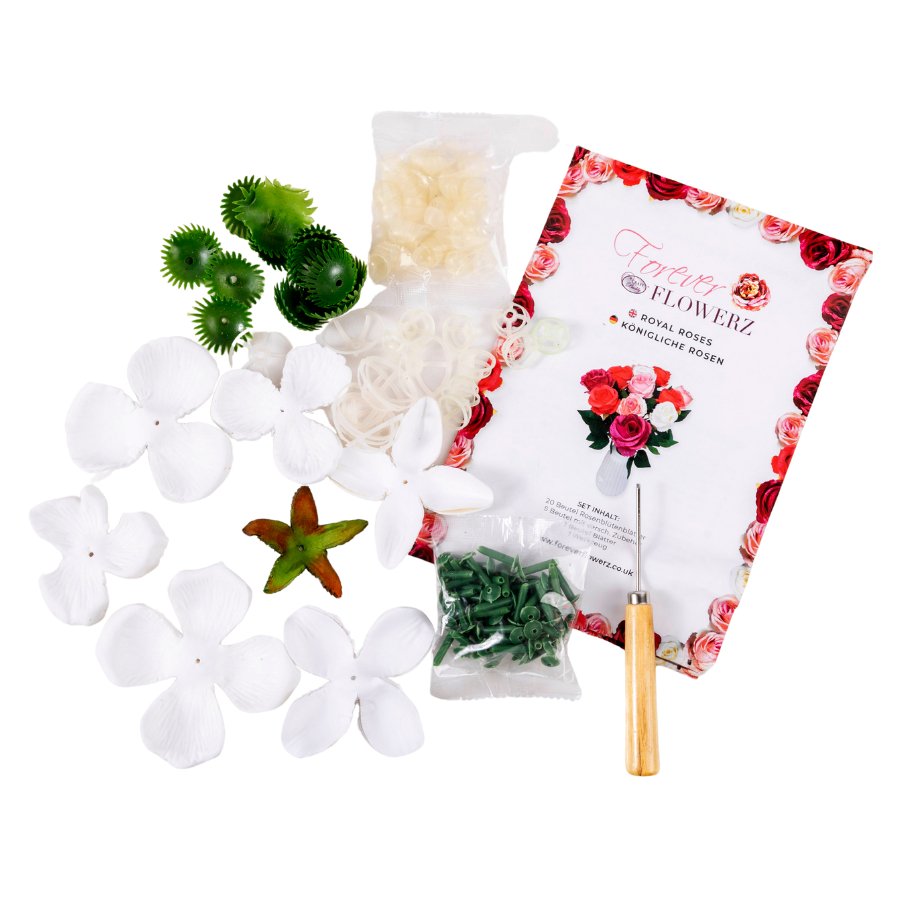 One of the most-loved blooms, the rose, now comes in a DIY kit from Forever Flowerz. This Royal Roses kit gives you everything you need to make approximately 60 rose heads in pure white, making them a perfect addition to any bloom pjoject. Whether, bouquet displays, wreaths, and other crafting projects.