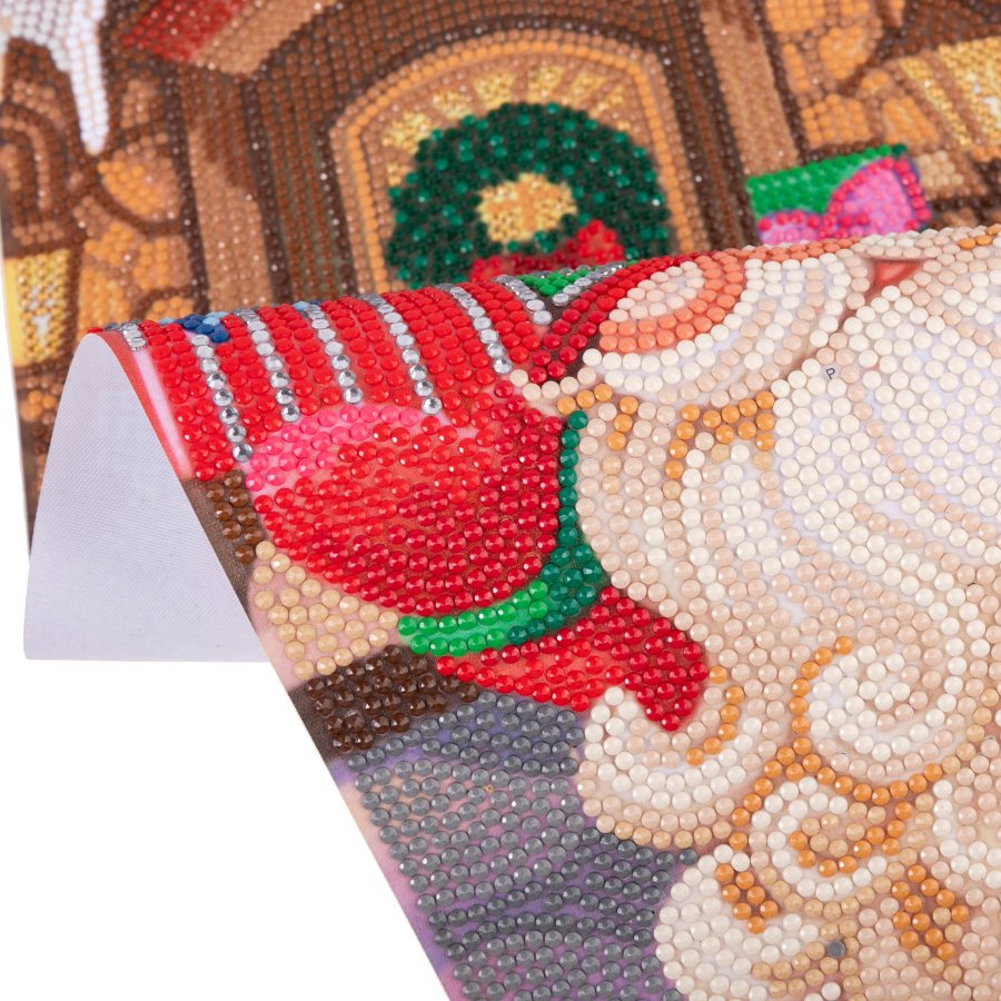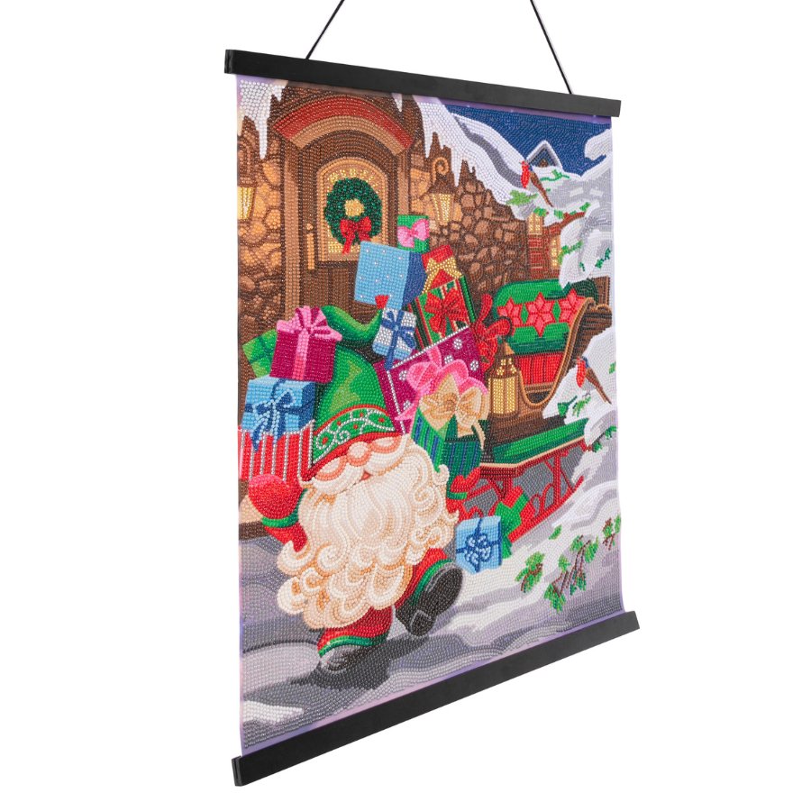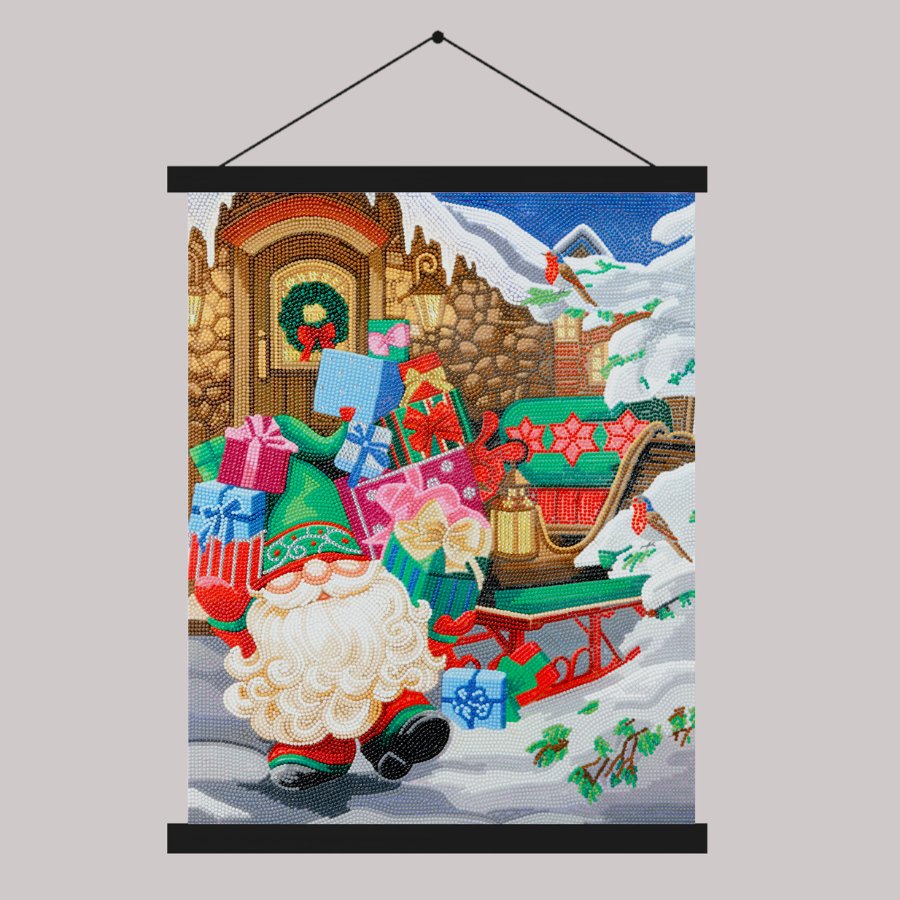 A sleigh bursting full of colourful gifts is a familiar Christmas image. The Craft Buddy Crystal Art® Scroll Kit adds an extra dimensions of ’sparkle’ to that scene! A bearded Santa-style gnome bursts forth from his festive doorway ready to start the gift delivery on Christmas Eve.