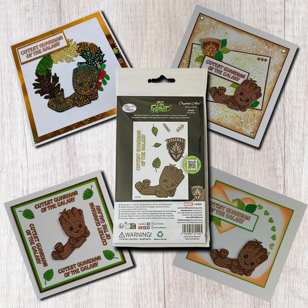 Presenting the Crystal Art A6 'Groot' Stamp Set, comprising 8 polymer stamps. Every stamped image boasts meticulously positioned small dots, perfectly suited for utilizing leftover Crystal Art drills, self-adhesive gems, pearls, liquid drops, and glitter glue. With this collection, effortlessly replicate captivating Crystal Art images repeatedly!