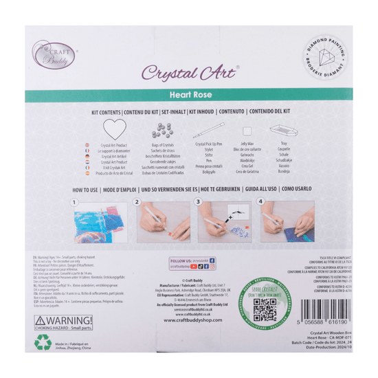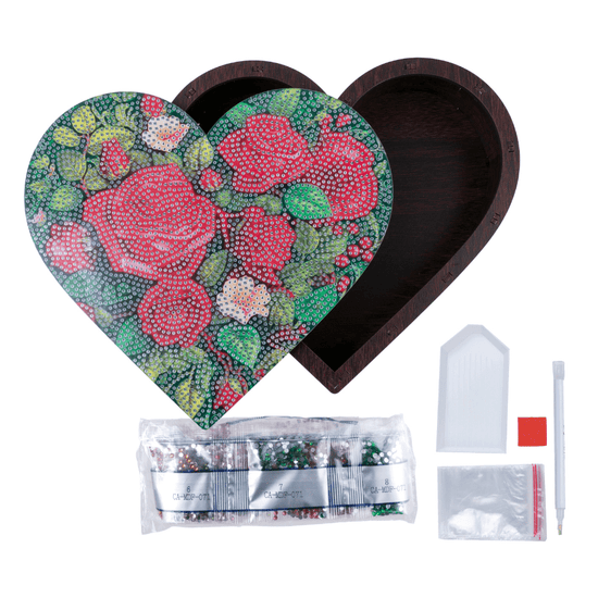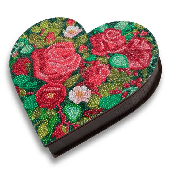 The Craft Buddy Crystal Art® 'Heart Rose' Box Kit is a real joy for any crafter or diamond painting enthusiast, whether you keep and craft yourself, or gift as a fun kit. Covered in vivid red roses, this exquisite trinket or jewellery box combines functionality with vivid sparkle, providing a unique way to keep your small possessions. The box is made from MDF, and comes with a lid printed with a Crystal Art® template, ready for your Diamond painting drill gems.