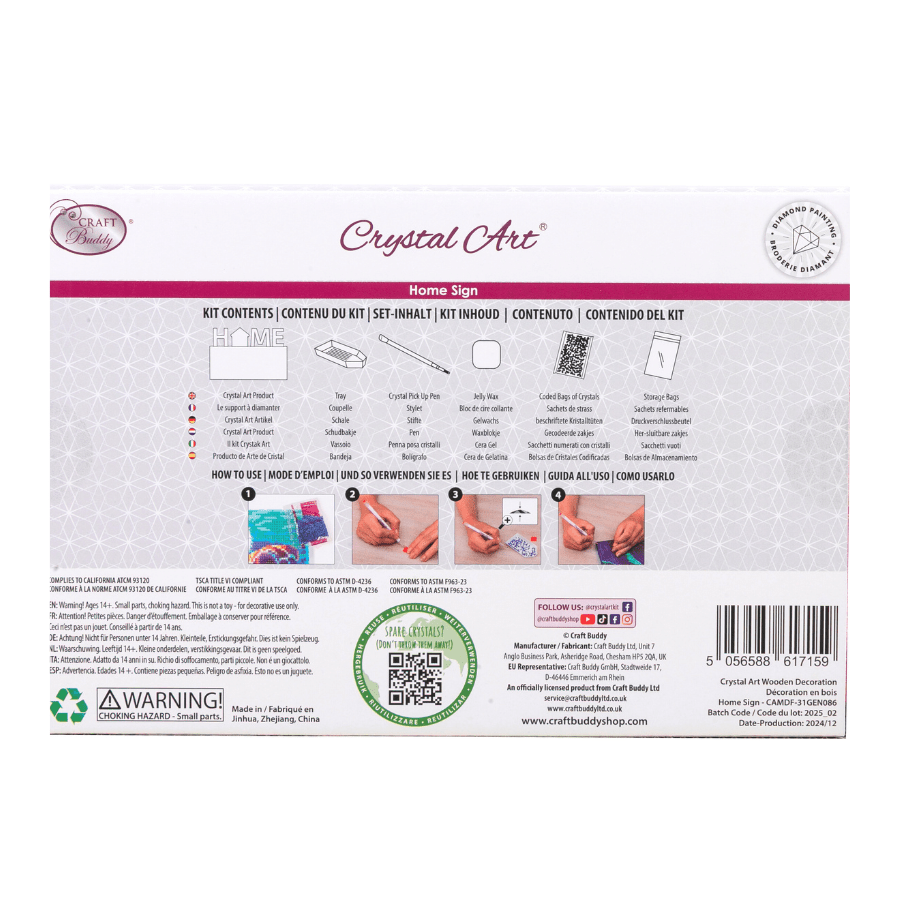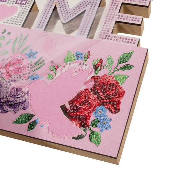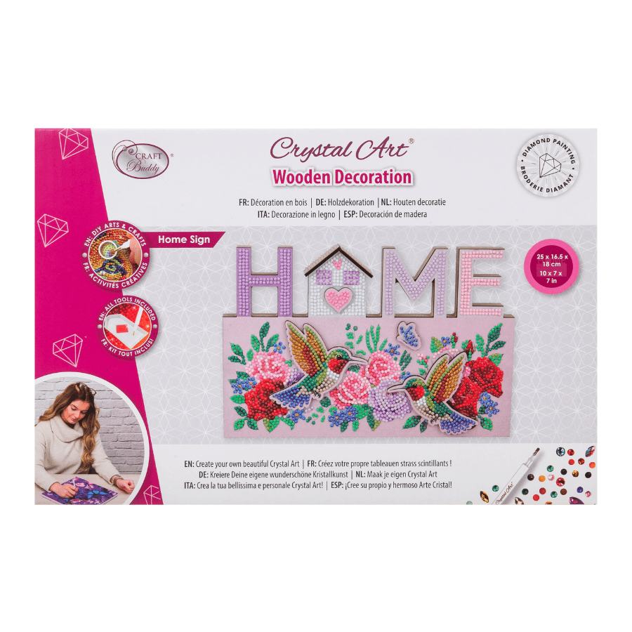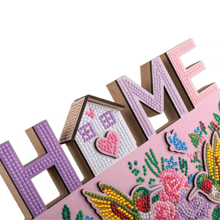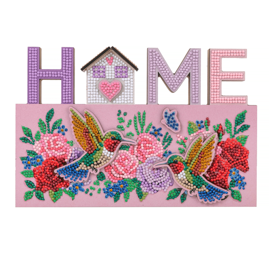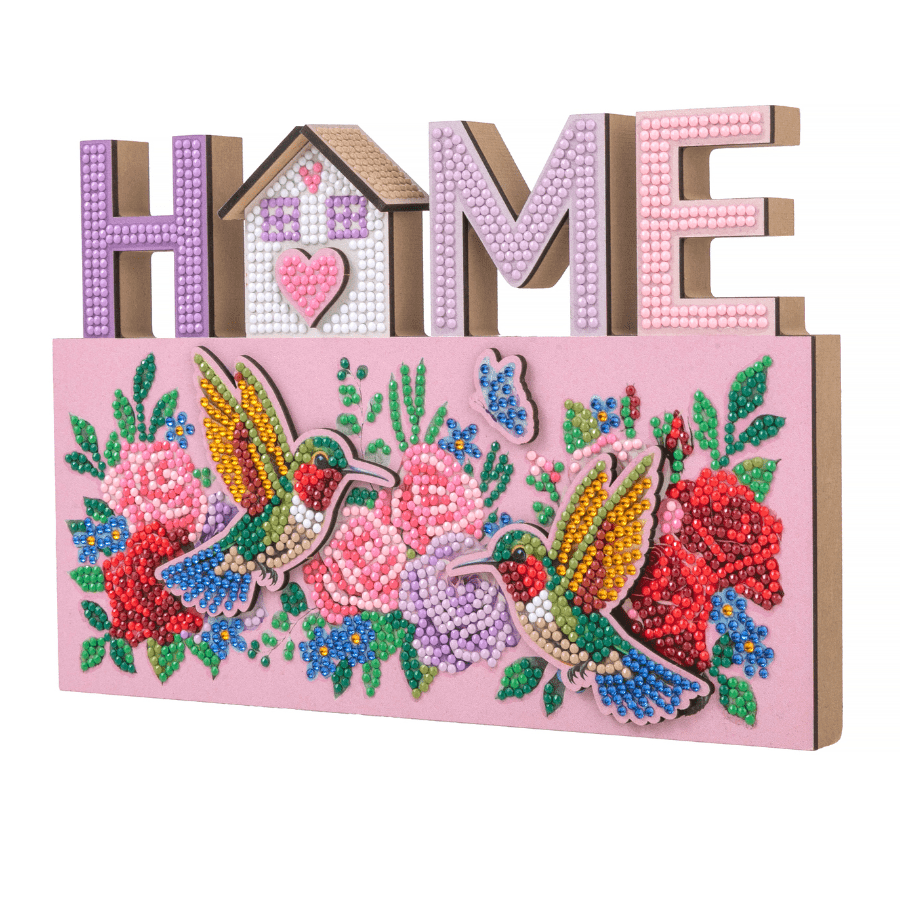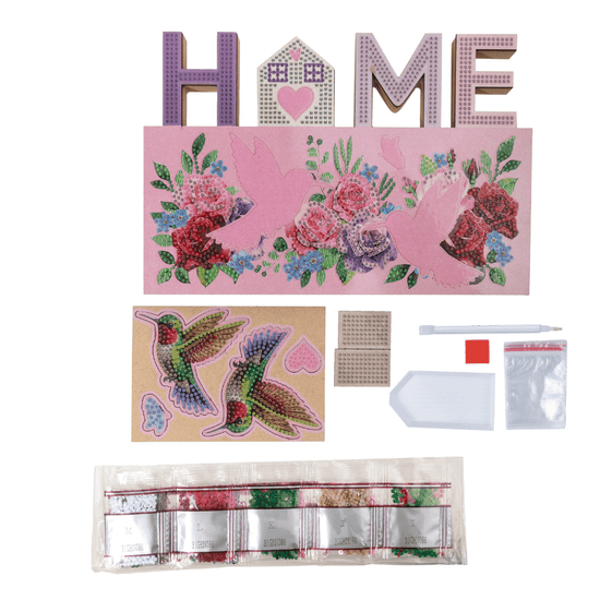 The Craft Buddy Crystal Art® 'Home Sign' Wooden Decoration give a pretty welcome to any space. Spelt out in pastel letters, the word 'HOME' is accented with a cute cottage, and stands atop a floral plaque. In vivid colours, two kingfishers fly 'home' over pretty flowers. Feminine yet striking, this whimsical welcome sign is a fun project for a shabby chic home decor look.
