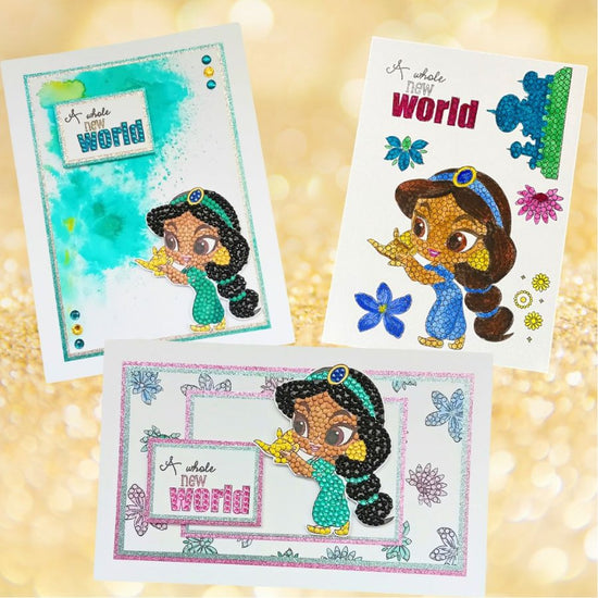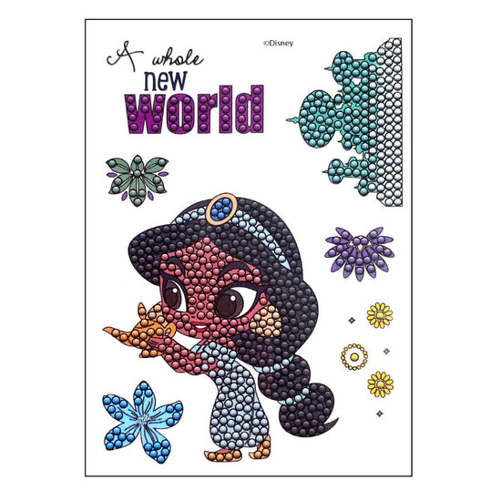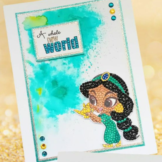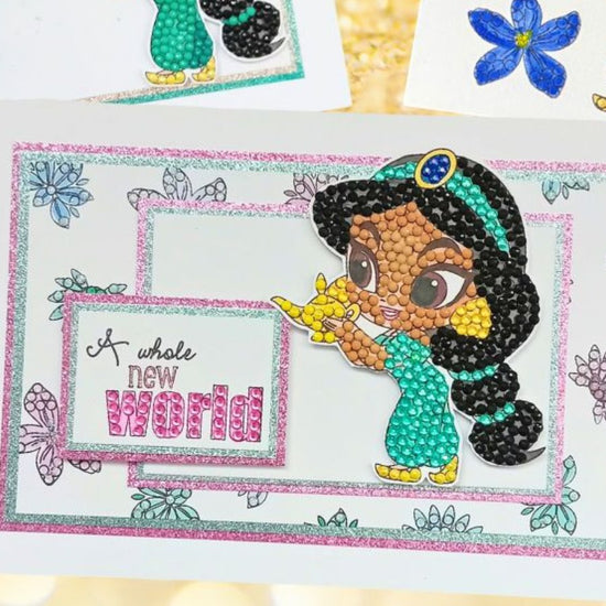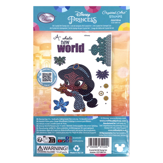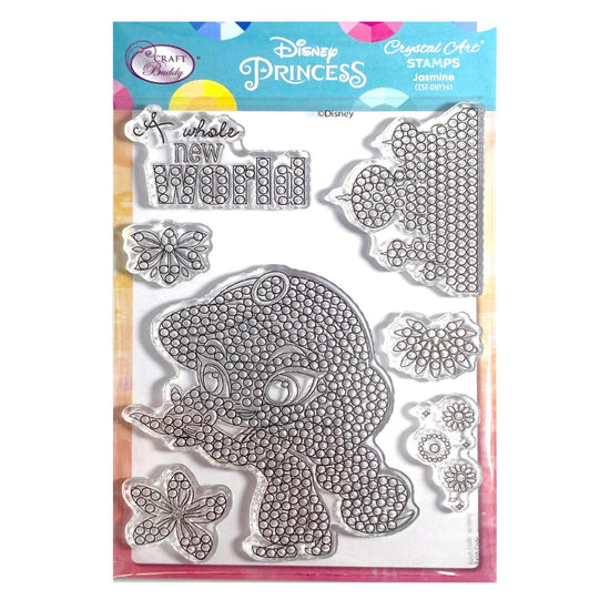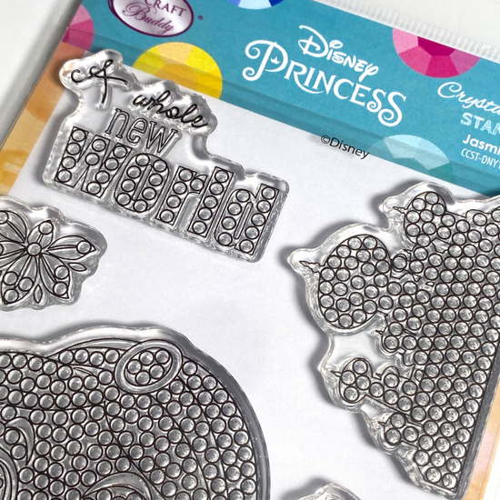One of the most well-loved characters from the 'Aladdin' Walt Disney animated movie can now be added to all aspects of your papercraft and cardmaking, with added sparkle. This Disney Princess in her aqua gown will look so pretty when embellished with sparkle (whatever colours of diamond art you choose to use). The A6 Carrier sheet holds 7 different stamps with a ‘Jasmine’ theme, including shapes, words and motifs.