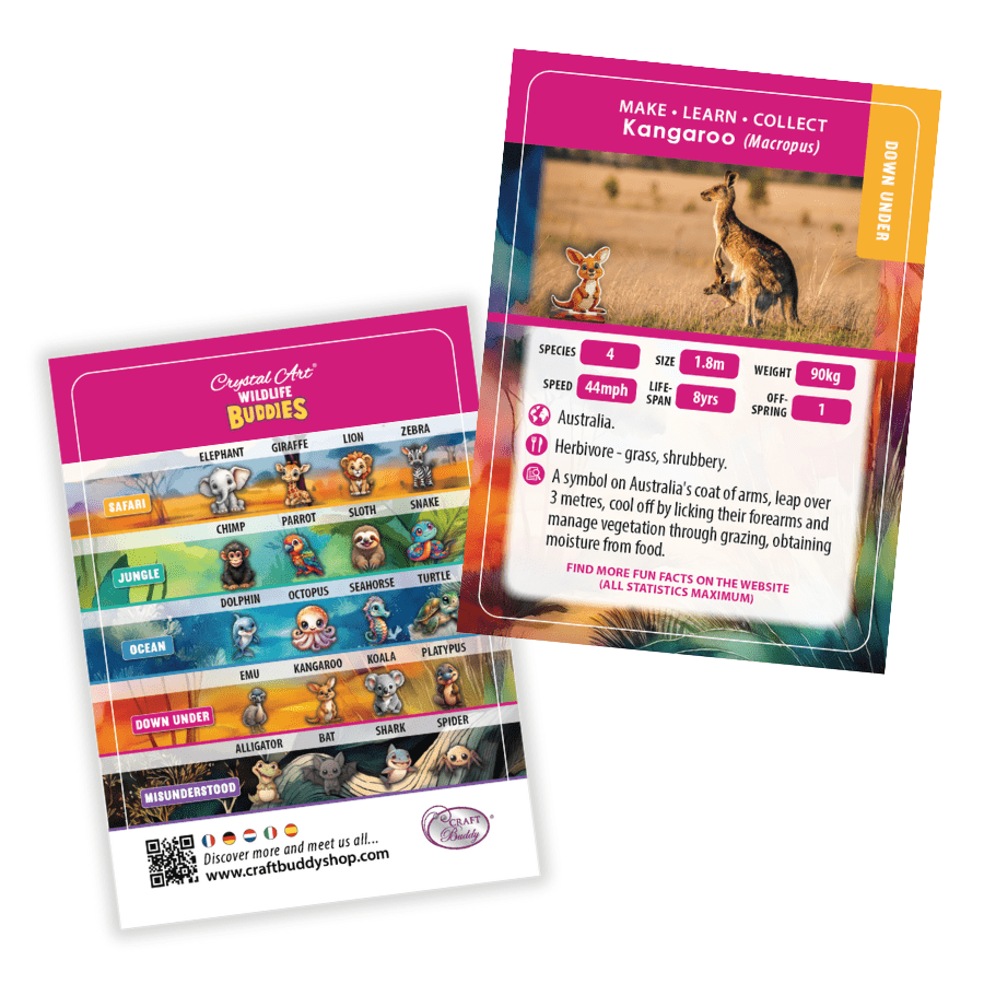 New for 2025, Craft Buddy brings you the collectable Crystal Art® Wildlife Buddies series. Featuring 20 original animal designs, each Crystal Creature has been given the diamond painting treatment, with fur, fins, tentacles and tails that will sparkle and shine. The new 'Series 5' range is made to be collected, whether you choose your favourite species or habitat. Why not go on a trek across wild deserts or swim the deep blue sea and collect the entire range!