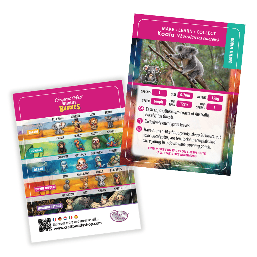 New for 2025, Craft Buddy brings you the collectable Crystal Art® Wildlife Buddies series. Featuring 20 original animal designs, each Crystal Creature has been given the diamond painting treatment, with fur, fins, tentacles and tails that will sparkle and shine. The new 'Series 5' range is made to be collected, whether you choose your favourite species or habitat. Why not go on a trek across wild deserts or swim the deep blue sea and collect the entire range!