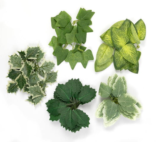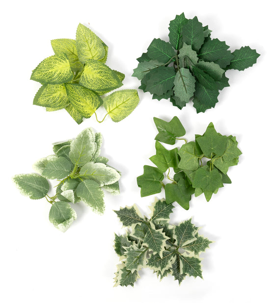 An assortment of 5 different types of foliage sprigs, 30 of each, all in a seasonal and festive collection. Giving the customer 150 connectable sections of foliage that fit the Forever Flowerz wreath and stems perfectly.