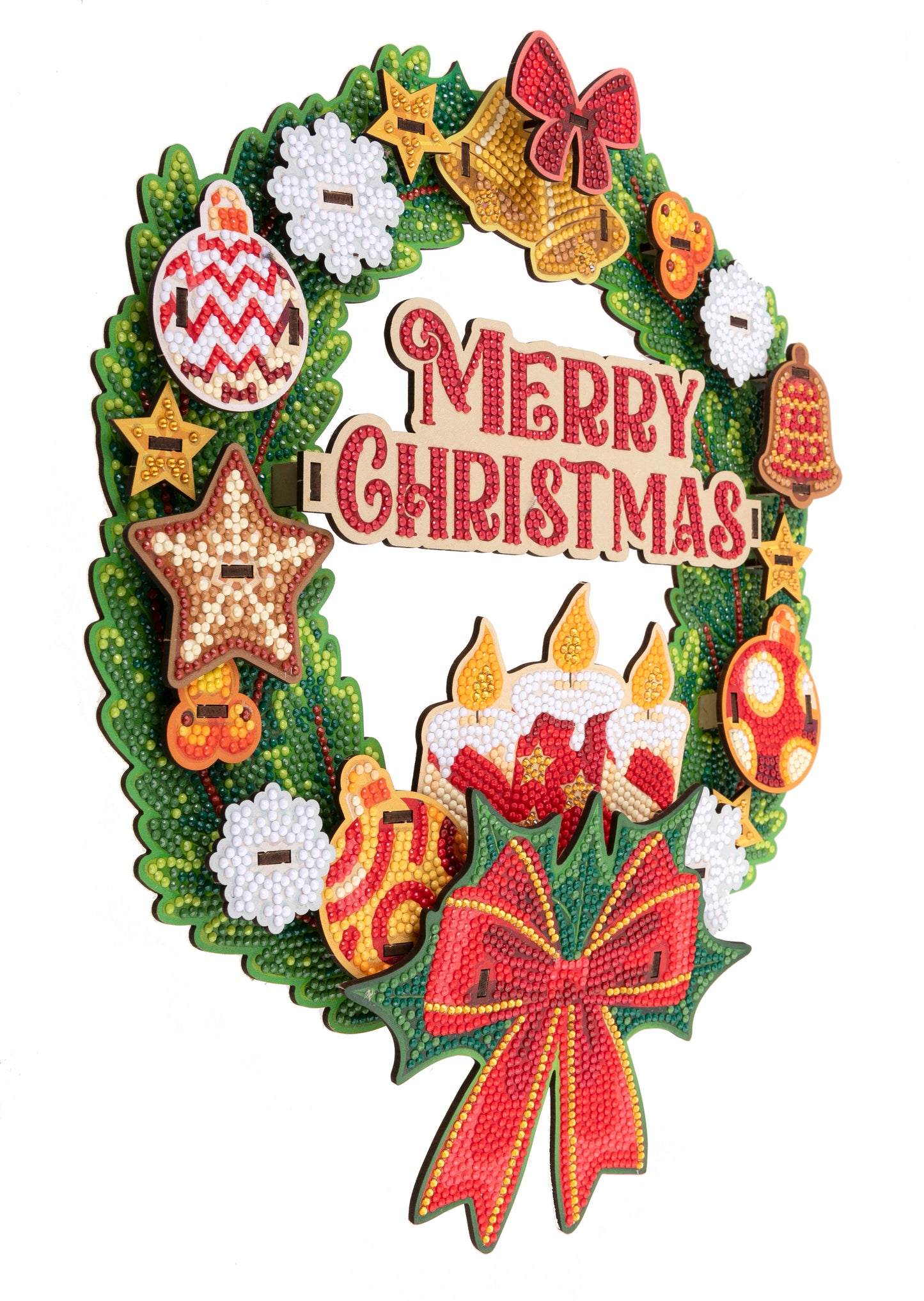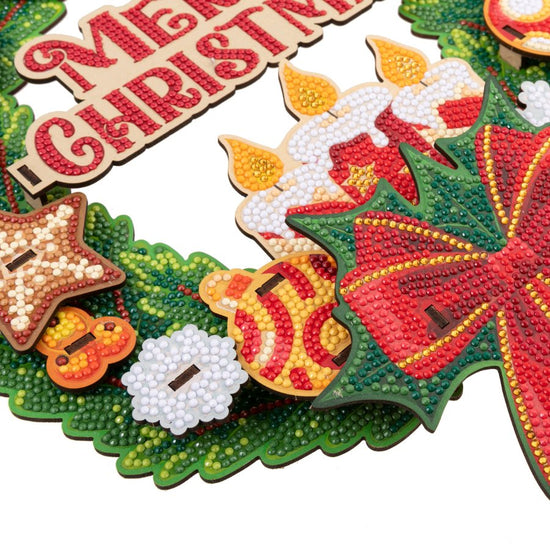 Add some sparkling diamond art to three-dimensional baubles, bells and bows! The novel Craft Buddy 'Merry Christmas' Crystal Art® 3D Wreath will make your front door or porch stand out from the street! Created with a unique set of 'slotted' template shapes that layer together, the wreath builds up to create depth and interest. With all the sparkling crystals in festive colours you need to complete the kit, the decoration is finished with a set of candles nestled at the front as a focal point.