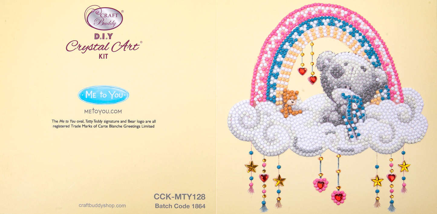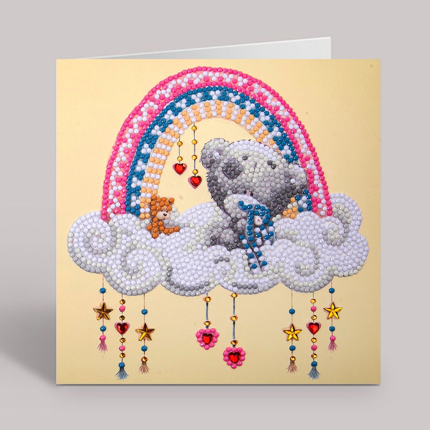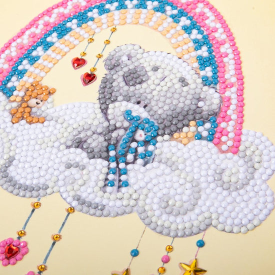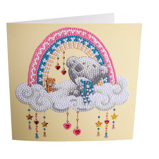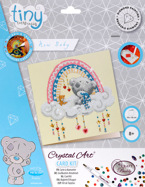 Introducing the 'New Baby' Me To You Crystal Art®Card Kit featuring a lovely Tiny 'Tatty Teddy' sitting on a cloud under a scintillating crystal rainbow. Officially licensed by Carte Blanche Greetings, this card is a heartfelt way to say 'Welcome to the world!' and is perfect for baby showers, first visits, or just to send your sparkling love to the little one and their family.