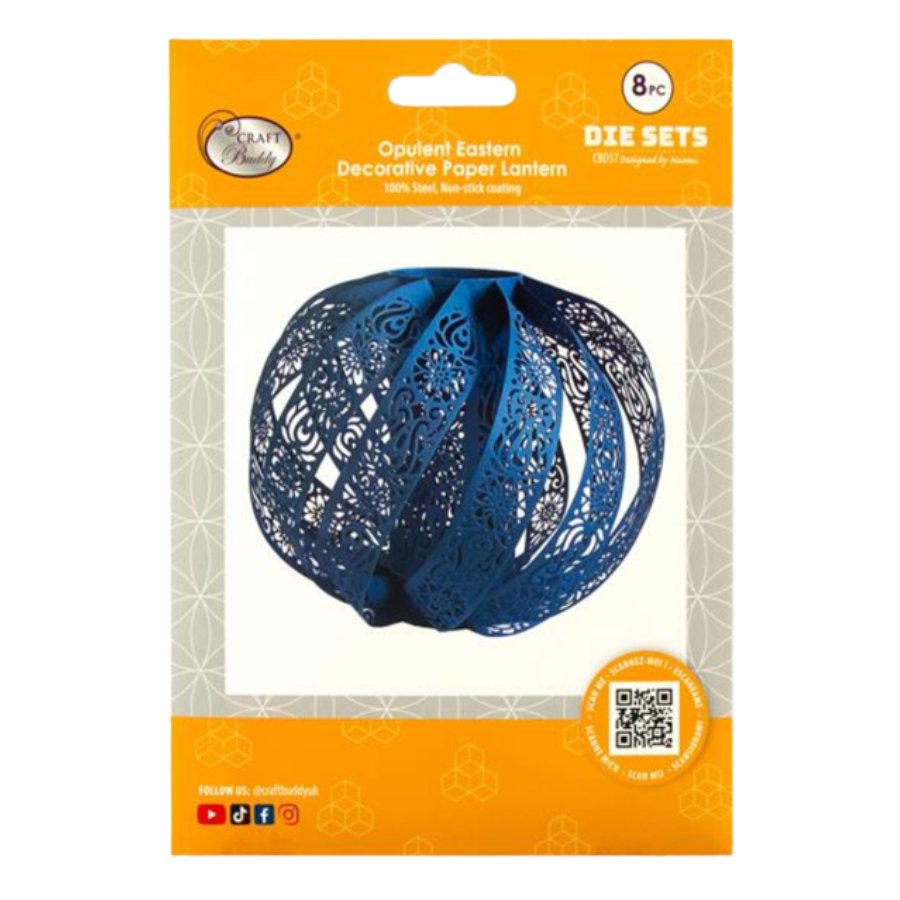 Create your very own stunning "Opulent Eastern" decorative lanterns with this amazing new die set from Craft Buddy. Use these metal cutting dies with an A4 die cutting machine to cut pieces from your favourite cardstock to make your very own lanterns to decorate your home and for celebrations, garden gatherings and parties. Once constructed the central tube within the lantern allows you to add in battery operated rice lights or an LED candle and the gorgeous filigree designs within the set will then allow light to illuminate your creation.