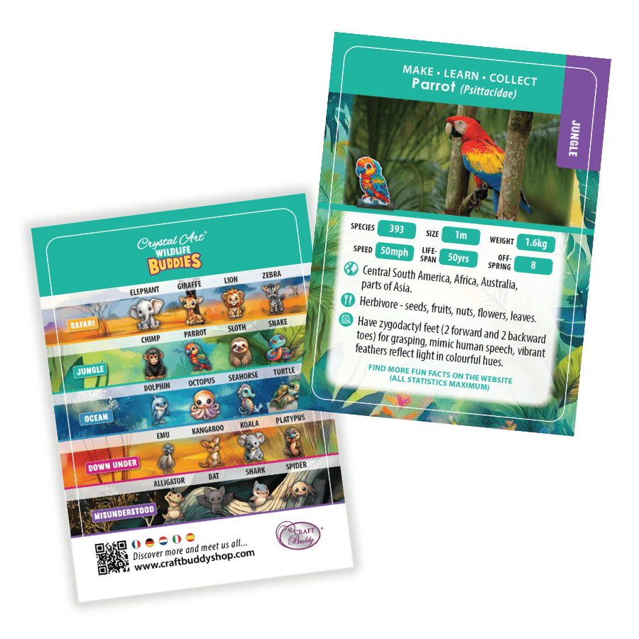 New for 2025, Craft Buddy brings you the collectable Crystal Art® Wildlife Buddies series. Featuring 20 original animal designs, each Crystal Creature has been given the diamond painting treatment, with fur, fins, tentacles and tails that will sparkle and shine. The new 'Series 5' range is made to be collected, whether you choose your favourite species or habitat. Why not go on a trek across wild deserts or swim the deep blue sea and collect the entire range!