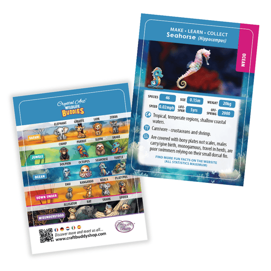 New for 2025, Craft Buddy brings you the collectable Crystal Art® Wildlife Buddies series. Featuring 20 original animal designs, each Crystal Creature has been given the diamond painting treatment, with fur, fins, tentacles and tails that will sparkle and shine. The new 'Series 5' range is made to be collected, whether you choose your favourite species or habitat. Why not go on a trek across wild deserts or swim the deep blue sea and collect the entire range!